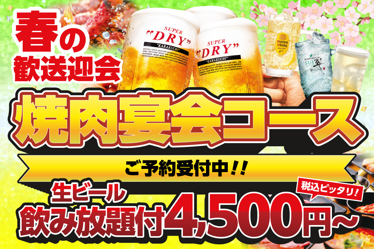 春の集まりは焼肉で一気に盛り上がる!安楽亭の焼肉宴会コース 歓送迎会にも気軽に使える生ビール飲み放題付き4,500円〜さらにお得に楽しめる選べる特典「早割特典」予約受付がスタート!
