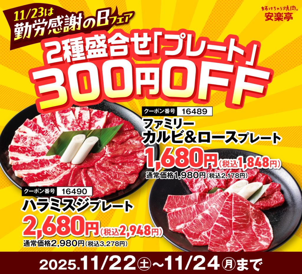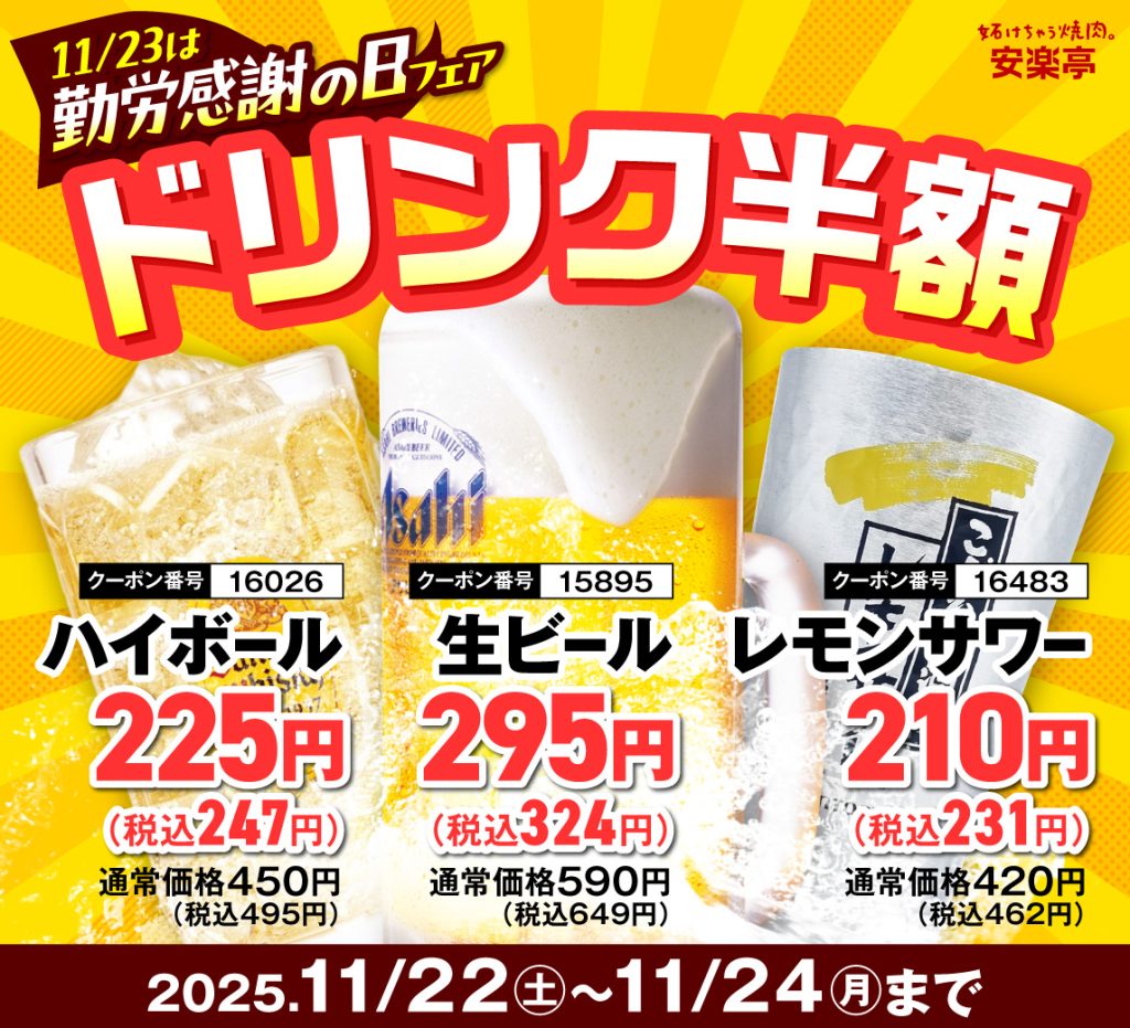 【毎日がんばる、すべての人へ】勤労感謝の日は“焼肉でお疲れ様” 11月22日~24日まで【安楽亭勤労感謝の日フェア】ドリンク半額でお得に乾杯♪焼肉盛合せ300円引き!働くみんなに“ご褒美焼肉”♪
