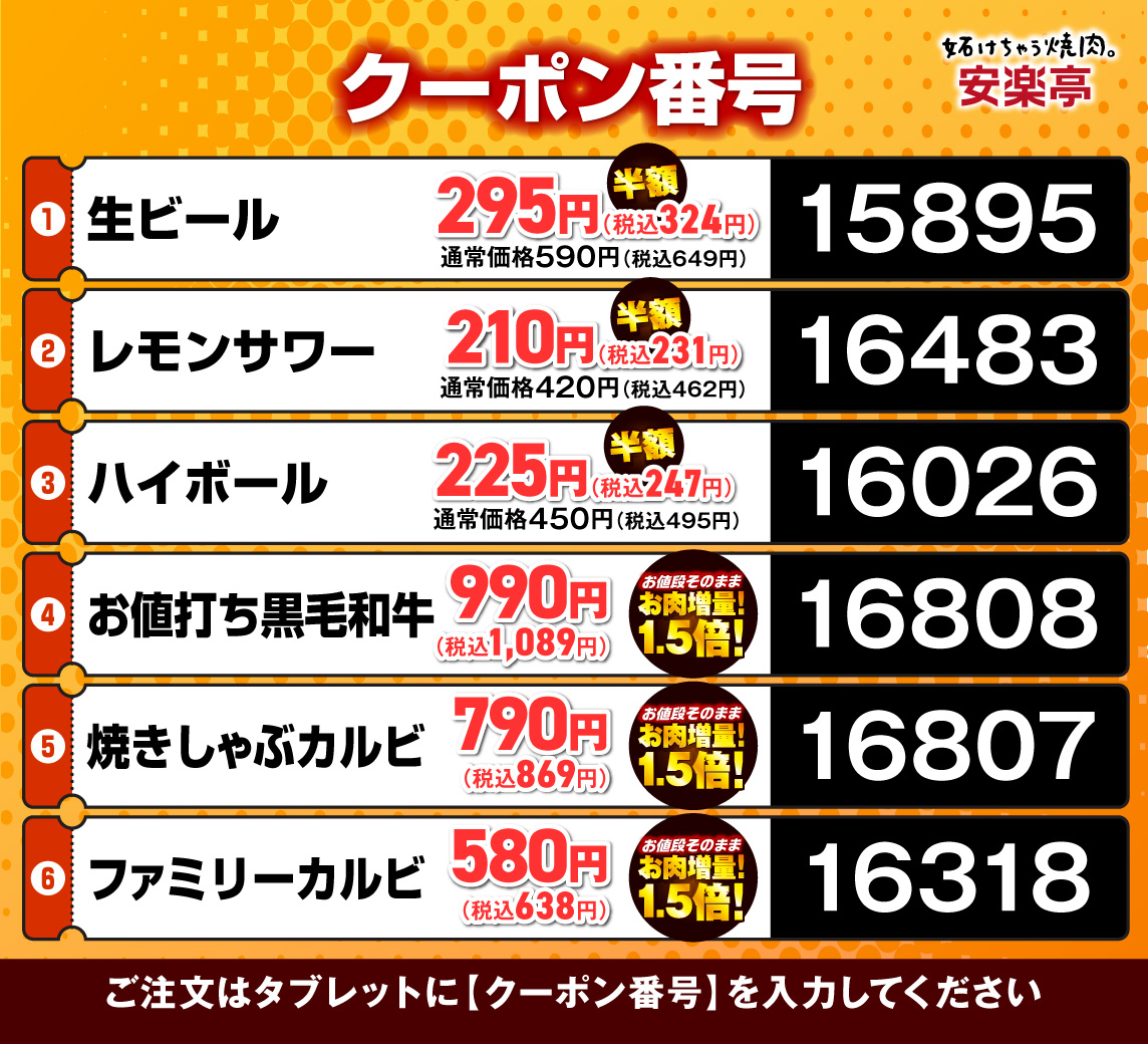 ◆ご注文時は卓上のタブレットで【クーポン番号】をご入力いただくか、従業員へ当クーポン画面をご提示ください。ご注文後の提示は無効となりますのでご注意ください。