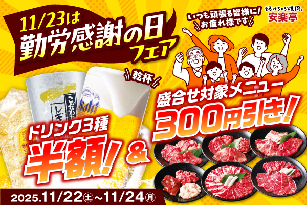 【毎日がんばる、すべての人へ】勤労感謝の日は“焼肉でお疲れ様” 11月22日~24日まで【安楽亭勤労感謝の日フェア】ドリンク半額でお得に乾杯♪焼肉盛合せ300円引き!働くみんなに“ご褒美焼肉”♪