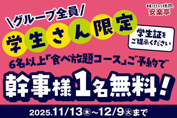 【学生を応援!!】全員学生なら🎉焼肉食べ放題パーティがお得に🥩6名様以上予約で【幹事様1名無料】 12月9日まで!!