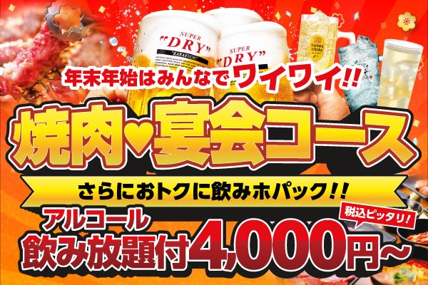 【忘新年会は安楽亭で焼肉祭り!】12月9日~ご予約で最大約670円お得な「飲みホパック」登場!!飲み放題付コースが税込4000円から~ピッタリ価格で幹事様も安心~さらに6名様以上ご予約で1名様分無料!