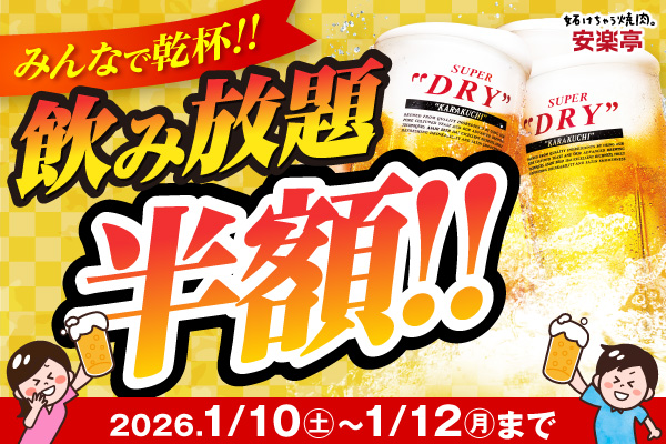 【3連休は新年会&成人のお祝いに】1/10(土)~1/12(月)安楽亭「焼肉×お酒」で盛り上がる「飲み放題半額」キャンペーン♪6名以上でコース幹事様1名無料や食べホ学割500円引きも。