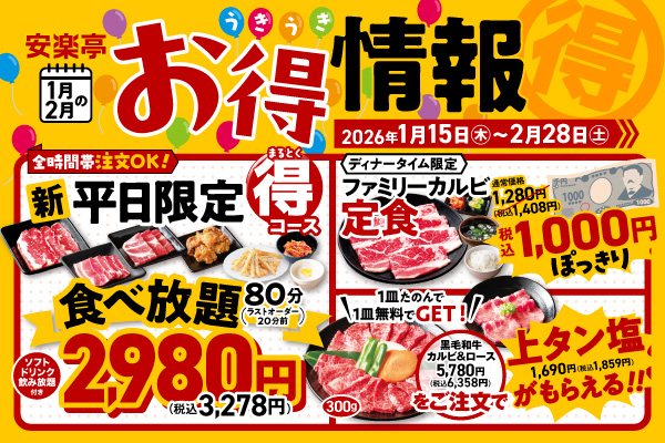 【焼肉好きは大注目!】1月15日~2月28日まで 安楽亭の焼肉がお得!食べ放題平日限定コース2,980円&人気定食1000円ポッキリ、黒毛和牛盛り合わせ注文で上タン塩がもらえる!