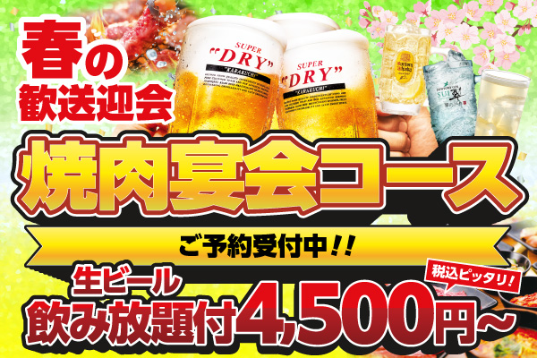 春の集まりは焼肉で一気に盛り上がる!安楽亭の焼肉宴会コース 歓送迎会にも気軽に使える生ビール飲み放題付き4,500円〜さらにお得に楽しめる選べる特典「早割特典」予約受付がスタート!