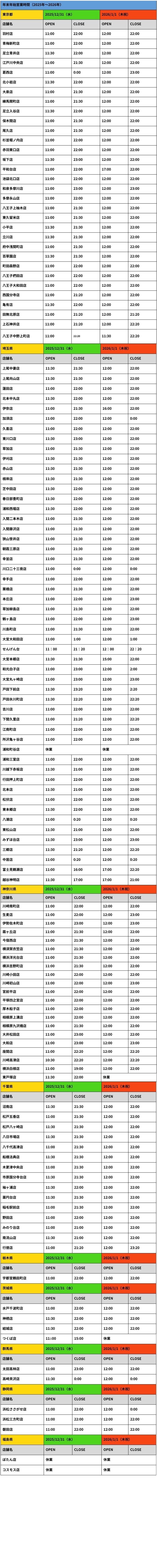 各店の年末年始営業時間は下記一覧にて、ご確認ください。