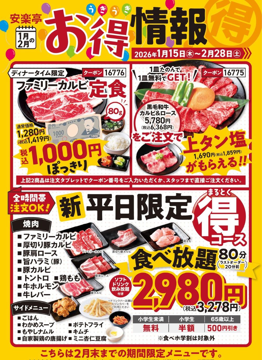 【焼肉好きは大注目!】1月15日~2月28日まで 安楽亭の焼肉がお得!食べ放題平日限定コース2,980円&人気定食1000円ポッキリ、黒毛和牛盛り合わせ注文で上タン塩がもらえる!