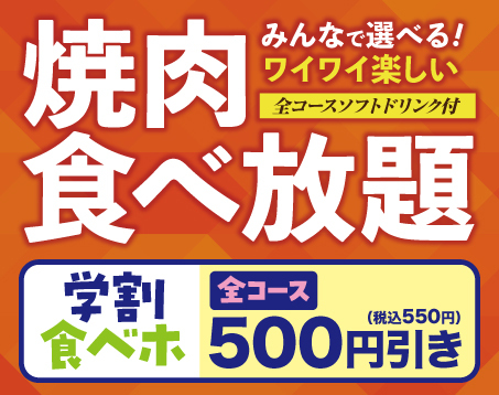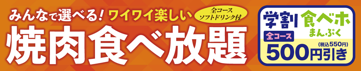 トップ メニュー紹介 MENU メニュー紹介 食べ放題メニュー グランドメニュー ご飯もの麺類ご注文で白ごはんお替り無料!スープ類ご注文でわかめスープおかわり無料! 大皿 焼肉単品 海鮮 焼き野菜 サンチュ・サラダ おつまみ・キムチ・ナムル ごはん・麺類 スープ 焼肉定食 キッズメニュー デザート ドリンク ランチ お食事宴会コースメニュー ちょい飲みメニュー お弁当メニュー アレルギー物質一覧表 アレルギー物質を表示しています。ご参考ください。