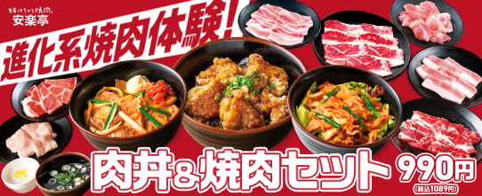 ニュース 一覧はこちら ── 進化系焼肉体験、はじまる。安楽亭の人気メニュー「肉丼&焼肉セット」が、CM動画になって登場!肉丼と焼肉、ふたつの満足を同時に楽しめる“進化系焼肉”をお届けしています! この価格でこの満足感!安楽亭の食べ放題に “おつまみ晩酌コース”2,980円(税込3,278円)新登場!「焼肉&おつまみ」で1杯じゃ終われない!気が付けば焼肉飲み無限ループ! 気軽に食べ放題が楽しめる「ペア焼肉コース」もスタート! フェア 一覧はこちら NEW 11月14日~16日「埼玉県民の日」に特別フェアを開催。創業の地・埼玉県に日頃の感謝を込めて「上タン塩」や「ワイルドカルビ/ロース」を限定価格で楽しむ、みんなの焼肉デー♪ NEW 「今日は焼肉呑みに決まり!」“平日夜がチャンス!”「安楽亭平日飲み放題半額」キャンペーン♪コースご予約で飲み放題「ライトパック」「生ビールパック」が半額に!!平日こそ焼肉×飲みでリフレッシュ♬ 終了 【毎月29日は肉の日】10月の安楽亭『肉の日』は10日間焼肉祭り開宴!!定番人気焼肉カルビやロース、牛タンが衝撃プライスに!さらに今月は人気ランチもお得♪肉好き必見のラインナップ! 終了 【安楽亭オクトーバーフェスト2025開催!】10月10日~ビール×焼肉の王道コンビで食欲の秋まつり!~生ビール特別価格&お値段そのままお肉1.5倍盛り 安楽亭の想い 美味しくて、安心して食べられる焼肉をずっとこれからも。 詳しくはこちら 「無添加」「安全・安心への取り組み」 安楽亭のこだわり 全てのプロセスを自社で一元管理し、安全・安心を徹底。 メニュー紹介 食べ放題メニュー、グランドメニュー、ランチ、お子様、宴会、ドリンク、定食、デザート フェア情報一覧 おトクなクーポン 店舗検索 ご予約 お客様の声〜ご意見・ご要望〜 安楽亭スマホアプリ 新店・改装のお知らせ 安楽亭スマホアプリ 新店・改装のお知らせ コーポレートサイト採用・IR資料・協力業者様のビジネスマッチングはこちらから コーポレートサイト採用・IR資料・協力業者様のビジネスマッチングはこちらから